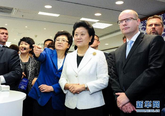 國(guó)務(wù)院副總理劉延?xùn)|(前排右二)和捷克總理索博特卡(前排右一)等在開幕式后參觀中國(guó)傳統(tǒng)醫(yī)藥展。新華社記者 錢一/攝