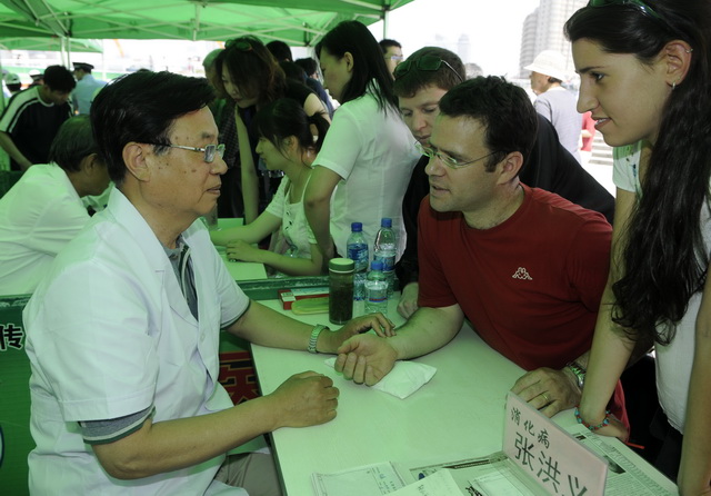 5月23日,在天津啟動(dòng)儀式上,天津中醫(yī)藥大學(xué)的專家位外國(guó)友人把脈看病