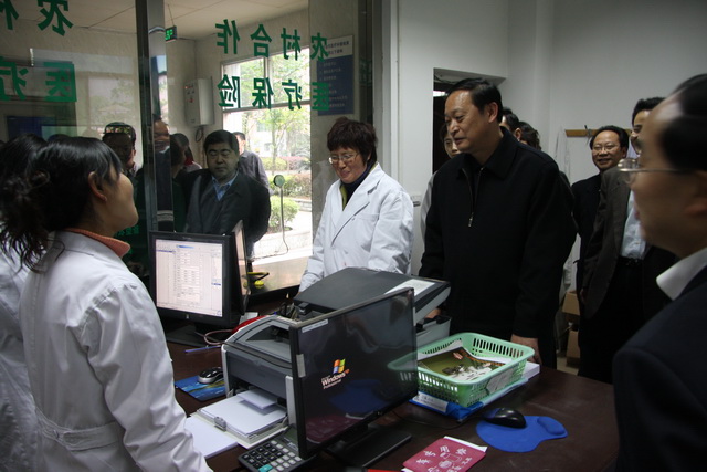 王國(guó)強(qiáng)副部長(zhǎng)在重慶市璧山縣璧城街道衛(wèi)生院二門(mén)診部與醫(yī)生和患者交談