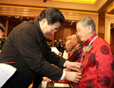 郭金龍、王國強(qiáng)、丁向陽等領(lǐng)導(dǎo)向獲得首都國醫(yī)名師的專家教授頒發(fā)獎?wù)潞妥C書。圖為郭金龍(左)為首都國醫(yī)名師路志正教授頒發(fā)獎?wù)隆?巨 鋒/攝 郭金龍、王國強(qiáng)、丁向陽等領(lǐng)導(dǎo)向10位第三批全國及北京市老中醫(yī)藥專家學(xué)術(shù)經(jīng)驗(yàn)繼承指導(dǎo)老師代表頒獎。圖為王國強(qiáng)(左)向獲獎指導(dǎo)老師代表張炳厚教授頒發(fā)獎金。 巨 鋒/攝