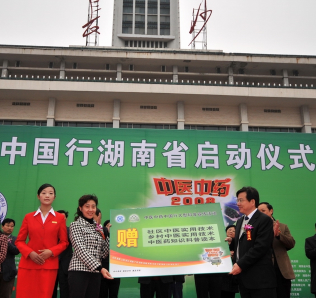2008年11月22日,“中醫(yī)中藥中國(guó)行”湖南省活動(dòng)在長(zhǎng)沙市啟動(dòng),衛(wèi)生部副部長(zhǎng)兼國(guó)家中醫(yī)藥管理局局長(zhǎng)王國(guó)強(qiáng)出席活動(dòng)并講話。全國(guó)組委會(huì)向湖南省贈(zèng)送了中醫(yī)藥科普?qǐng)D書(shū)和醫(yī)療設(shè)備。湖南省甘霖副省長(zhǎng)宣布"中醫(yī)中藥中國(guó)行"湖南省活動(dòng)啟動(dòng).。啟動(dòng)儀式上發(fā)表了湖南中醫(yī)藥人“弘揚(yáng)國(guó)粹,振興中醫(yī)”宣言,即將走進(jìn)社區(qū)的百名中醫(yī)藥博士進(jìn)行了集體宣誓?;顒?dòng)當(dāng)天還開(kāi)展了中醫(yī)藥專家為市民義診、中醫(yī)藥科普展覽展示、資料發(fā)放、游戲互動(dòng)等群眾喜聞樂(lè)見(jiàn)的多種活動(dòng)。在未來(lái)一周內(nèi),"中醫(yī)中藥中國(guó)行"活動(dòng)將在全省14個(gè)市州陸續(xù)舉行,讓中醫(yī)藥知識(shí)進(jìn)農(nóng)村、進(jìn)社區(qū)、進(jìn)家庭,惠及廣大民眾。