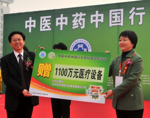 中國科協(xié)書記處書記程?hào)|紅(右)代表組委會(huì)向湖北省贈(zèng)送醫(yī)療設(shè)備_省衛(wèi)生廳副廳長姚運(yùn)接受捐贈(zèng)(巨鋒攝)