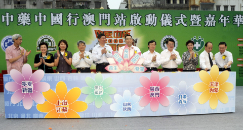 10月12日,中醫(yī)中藥中國行澳門站活動在澳門塔石廣場隆重舉行。圖為國家中醫(yī)藥局副局長李大寧(左五), 澳門特區(qū)社會文化司司長崔世安(左六),澳門特區(qū)社會文化司司長辦公室主任譚俊榮(左七),澳門特區(qū)衛(wèi)生局局長李展?jié)?左四),香港特區(qū)衛(wèi)生署署長林秉恩(左八),國家中醫(yī)藥局新聞辦主任蔣健(左九),國家中醫(yī)藥局國際合作司副司長王笑頻(左三),廣東省衛(wèi)生廳副廳長彭煒(左二),澳門特區(qū)政府行政發(fā)言人唐志堅(左十),澳門立法委議員梁慶平(左十一)、崔世平(左一)為活動揭幕。