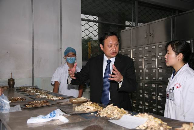 王國強(qiáng)副部長兼局長在咸輝副省長(左一)陪同下,視察省中醫(yī)院了解院內(nèi)制劑情況(攝影 喬建安)