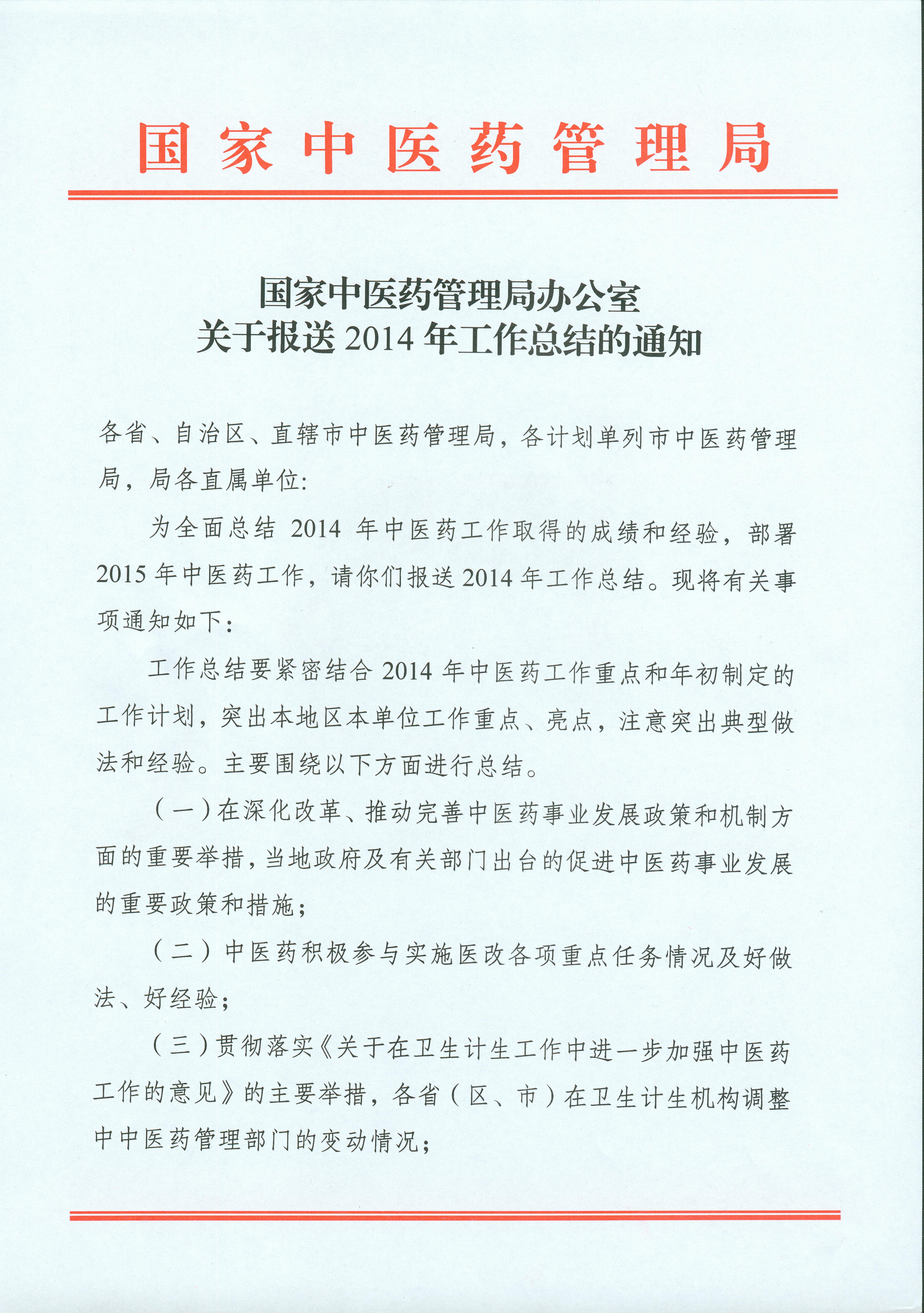 為全面總結(jié)2014年中醫(yī)藥工作取得的成績(jī)和經(jīng)驗(yàn),部署2015年中醫(yī)藥工作,請(qǐng)你們報(bào)送2014年工作總結(jié)?,F(xiàn)將有關(guān)事項(xiàng)通知如下: 工作總結(jié)要" />