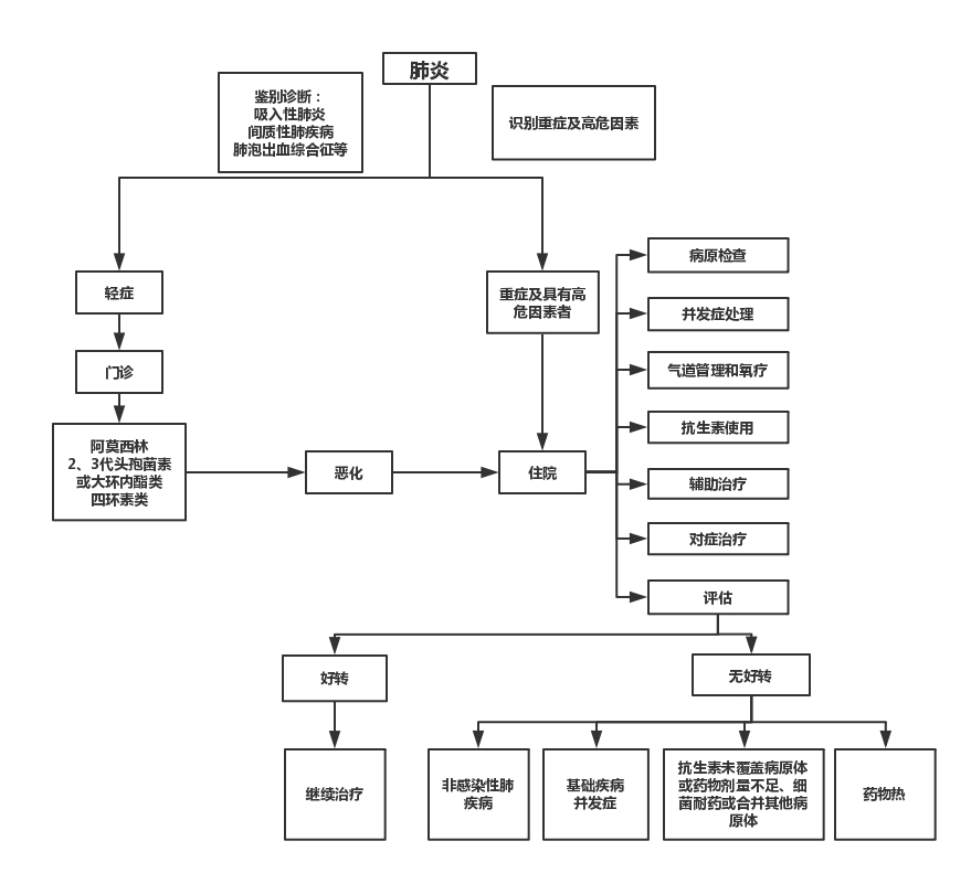 2.再次評(píng)估。所有患者經(jīng)48~72小時(shí)治療癥狀無改善或一度改善又惡化,應(yīng)再次進(jìn)行臨床或/和實(shí)驗(yàn)室評(píng)估,并考慮如下問題:(1)抗生素未能覆蓋致病菌;(2)抗生素劑量不足或存在影響抗生素療效的因素;(3)細(xì)菌耐藥或者合并其他感染;(4)存在基礎(chǔ)疾病,包括氣道問題;(5)出現(xiàn)并發(fā)癥;(6)藥物熱;(7)非感染性肺炎,如間質(zhì)性肺疾病、血管炎、腫瘤等少見疾病。