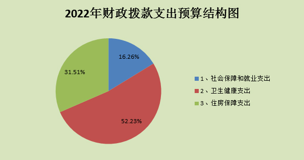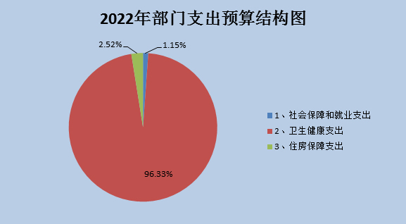 2022年支出預算3800.25萬元,其中:社會保障和就業(yè)支出43.83萬元,占1.15%,衛(wèi)生健康支出3660.79萬元,占96.33%,住房保障支出95.63萬元,占2.52% 。