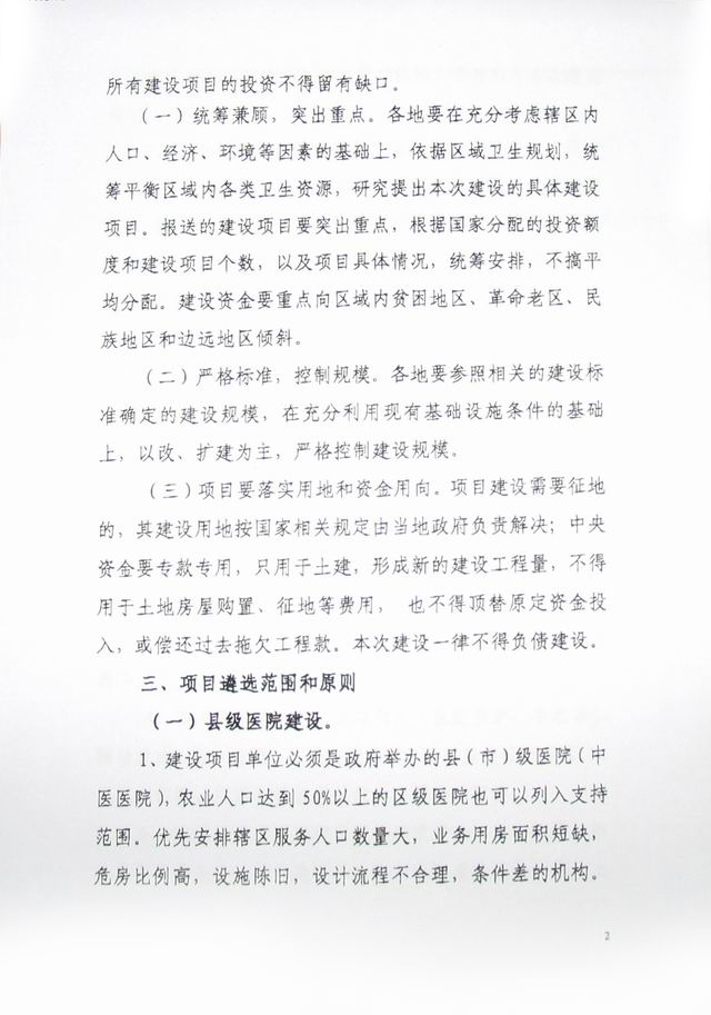1、建設(shè)項(xiàng)目單位必須是政府舉辦的縣(市)級醫(yī)院(中醫(yī)醫(yī)院),農(nóng)業(yè)人口達(dá)到50%以上的區(qū)級醫(yī)院也可以列入支持范圍。優(yōu)先安排轄區(qū)服務(wù)人口數(shù)量大,業(yè)務(wù)用房面積短缺,危房比例高,設(shè)施陳舊,設(shè)計(jì)流程不合理,條件差的機(jī)構(gòu)。已達(dá)到或基本達(dá)到建設(shè)標(biāo)準(zhǔn)的醫(yī)療機(jī)構(gòu),不再列入本次建設(shè)規(guī)劃。