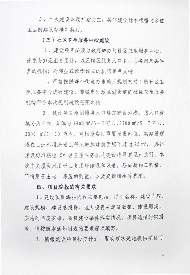 10萬人。可根據(jù)實(shí)際需要設(shè)置床位,其建設(shè)規(guī)模在上述標(biāo)準(zhǔn)基礎(chǔ)上每床增加建筑面積不超過25㎡, 具體建設(shè)標(biāo)準(zhǔn)根據(jù)《社區(qū)衛(wèi)生服務(wù)機(jī)構(gòu)建設(shè)指導(dǎo)意見》執(zhí)行。本次中央投資只用于業(yè)務(wù)用房建設(shè)和改造,形成新的工程量,不得用于土地、房屋的購置,以及交納租金等費(fèi)用?!?/div>