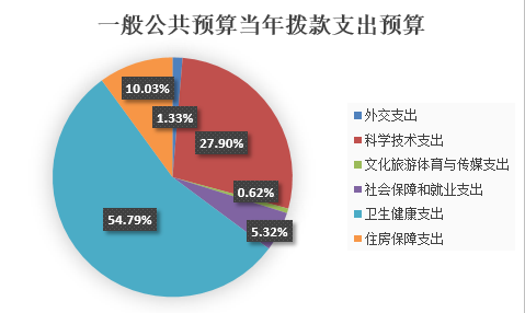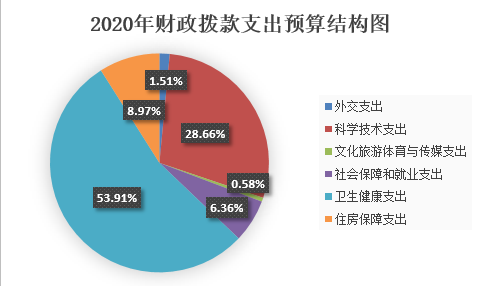 外交支出2016萬元,占1.33%;科學技術支出42199.43萬元,占27.90%;文化旅游體育與傳媒支出940萬元,占0.62%;社會保障和就業(yè)支出8053.02萬元,占5.32%;衛(wèi)生健康支出82875.58萬元,占54.79%;住房保障支出15170萬元,占10.03%。