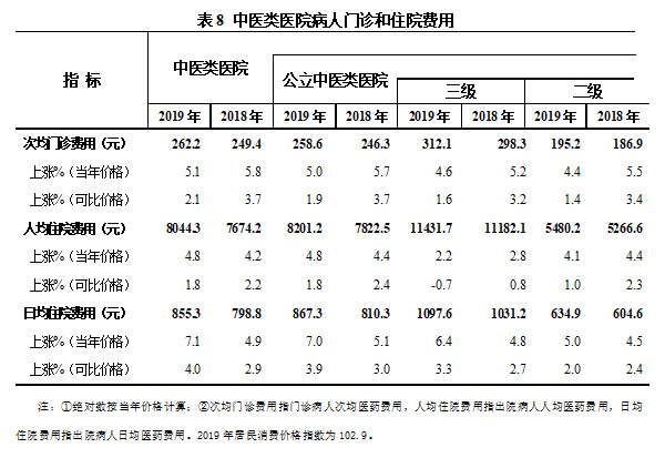 2019年,中醫(yī)類醫(yī)院次均門診費用262.2元,按當年價格比上年上漲5.1%,按可比價格上漲2.1%;人均住院費用8044.3元,按當年價格比上年上漲4.8%,按可比價格上漲1.8%。日均住院費用855.3元(見表8)。