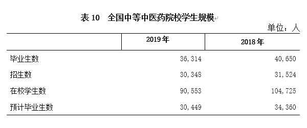 2019年,全國中等中醫(yī)藥學校畢業(yè)生數(shù)36,314人、招生數(shù)30,348人、在校學生數(shù)90,553人、預計畢業(yè)生數(shù)30,449人。與2018年相比,畢業(yè)生數(shù)、招生數(shù)、在校生數(shù)、預計畢業(yè)生數(shù)均有所減少,降幅分別為10.7%、3.7%、13.5%、11.4%。(見表10)。