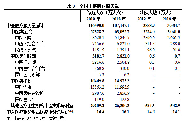 2019年,全國中醫(yī)總診療人次達11.6億人次,比上年增加0.9億人次,增幅8.6%;中醫(yī)診療量占全國總診療量的16.4%。其中:中醫(yī)類醫(yī)院6.8億人次、中醫(yī)類門診部及診所2.0億人次、其他醫(yī)療衛(wèi)生機構中醫(yī)類臨床科室2.9億人次。