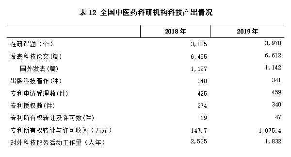 2019年,全國中醫(yī)藥科研機構在研課題共3,978個,比2018年的3,805個增加了173個,增幅4.5%。發(fā)表科技論文6,612篇,其中國外發(fā)表1,142篇,出版科技著作341種。比2018年全國中醫(yī)藥科研機構發(fā)表的6,455篇科技論文增加了157篇,增幅為2.4%。