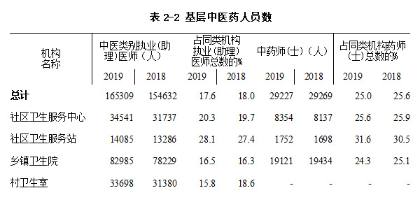 2019年全國基層中醫(yī)類別執(zhí)業(yè)(助理)醫(yī)師達165,309人,比2018年增加10,677人,增長率為6.9%;社區(qū)衛(wèi)生服務中心、社區(qū)衛(wèi)生服務站、鄉(xiāng)鎮(zhèn)衛(wèi)生院和村衛(wèi)生室的分別較2018年增長2,804、799、4,756和2,318人,增長率分別為8.8%、6.0%、6.1%和7.4%。2019年基層中醫(yī)類別執(zhí)業(yè)(助理)醫(yī)師占同類機構執(zhí)業(yè)(助理)醫(yī)師總數(shù)的17.6%,較2018年下降0.4個百分點;社區(qū)衛(wèi)生服務中心、社區(qū)衛(wèi)生服務站、鄉(xiāng)鎮(zhèn)衛(wèi)生院分別較2018年增加0.6、0.7和0.2個百分點,村衛(wèi)生室下降2.8個百分點。