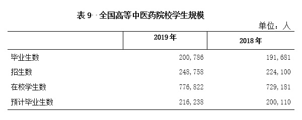 2019年,全國高等中醫(yī)藥院校畢業(yè)生數(shù)200,786人、招生數(shù)248,758人、在校學生數(shù)776,822人、預計畢業(yè)生數(shù)216,238人。與2018年相比分別增加9,105人、24,658人、47,641人、16,128人,增幅分別為4.8%、11.0%、6.5%、8.1%。(見表9)。