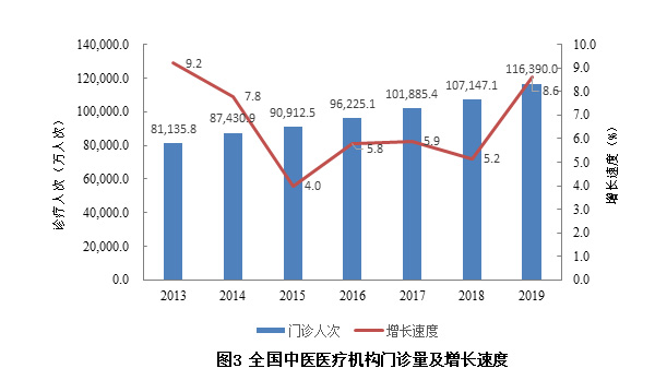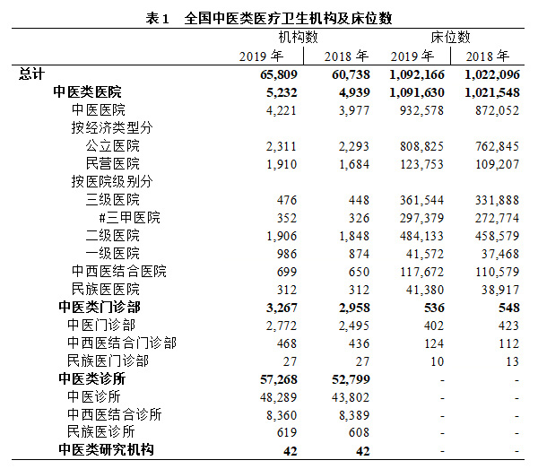 2019年全國衛(wèi)生機構中中醫(yī)類醫(yī)療衛(wèi)生機構(包括中醫(yī)類醫(yī)院、中醫(yī)類門診部、中醫(yī)類診所及隸屬于衛(wèi)生部門的中醫(yī)類科研機構)達到65,809個,與2018年的60,738個相比,增加了5,071個,增幅為8.3%。占全國衛(wèi)生機構總數(shù)的6.5%,高于2018年的6.1%。