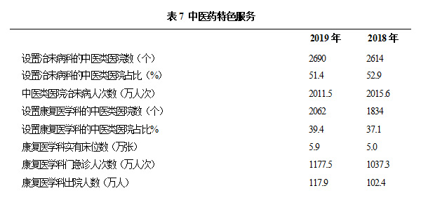 2019年,設置康復醫(yī)學科的中醫(yī)類醫(yī)院(2062個),占39.4%,比上年(37.1%)增加2.3個百分點;康復醫(yī)學科床位數(shù)5.9萬張、門急診人次數(shù)為1177.5萬人次、出院人數(shù)為117.9萬人,分別比2018年增加了0.9萬張、140.2萬人次、15.5萬人。(見表7)