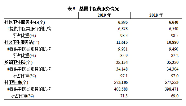 2019年,提供中醫(yī)藥服務的社區(qū)衛(wèi)生服務中心、社區(qū)衛(wèi)生服務站、鄉(xiāng)鎮(zhèn)衛(wèi)生院、村衛(wèi)室②分別為6878個、9981個、34148個、408588個,所占同類機構比重分別為98.3%、85.9%、97.1%、71.3%,與2018年相比,社區(qū)衛(wèi)生服務中心、社區(qū)衛(wèi)生服務站分別降低0.2、1.3個百分點,鄉(xiāng)鎮(zhèn)衛(wèi)生院、村衛(wèi)室分別增長0.1、2.3個百分點(見表5)。