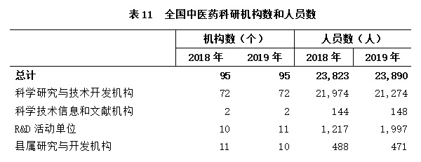 2019年,全國中醫(yī)藥科研機構共95個,其中:科學研究與技術開發(fā)機構72個;科學技術信息和文獻機構2個;R&D活動單位11個;縣屬研究與開發(fā)機構10個。機構數(shù)與2018年持平(見表11)。