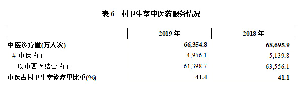 2019年,村衛(wèi)生室中醫(yī)診療量達66354.8萬人次,占村衛(wèi)生室診療量的41.4%,中醫(yī)診療量比2018年減少2341.4萬人次,但占比增長0.3個百分點。