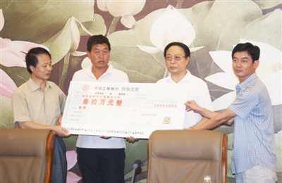 以嶺藥業(yè)董事長(zhǎng)吳以嶺(右二)向河北涿鹿縣蟒石口鎮(zhèn)黃花口村交付援助資金。