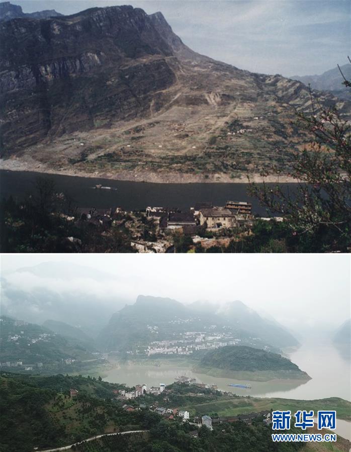 中游秭歸縣長江村。拼版照片:上圖為滑坡后的秭歸縣新灘古鎮(zhèn)(新華社發(fā),資料照片);下圖為7月6日拍攝的湖北省秭歸縣屈原鎮(zhèn)長江村。(新華社記者 王斯班攝)