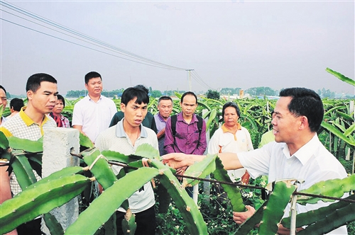 港南區(qū)農(nóng)業(yè)專家為工作隊員、種植大戶及群眾代表講授火龍果科學種植技術(shù)