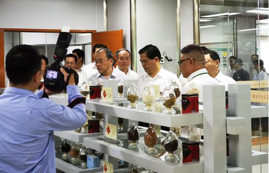 云南省委書記陳豪(右四),云南省委副書記、省長 阮成發(fā)(左四),廣東省委副書記、深圳市委書記王偉中(左三)、廣東省副省長 覃偉中(左二),中山市委書記陳旭東(左一)、中山市委副書記,中山市市長危偉漢(右二),中智藥業(yè)集團(tuán)董事長、總裁 賴智填(右三),中智藥業(yè)集團(tuán)副總裁 賴穎豐(右一)在破壁飲片重點(diǎn)研究室