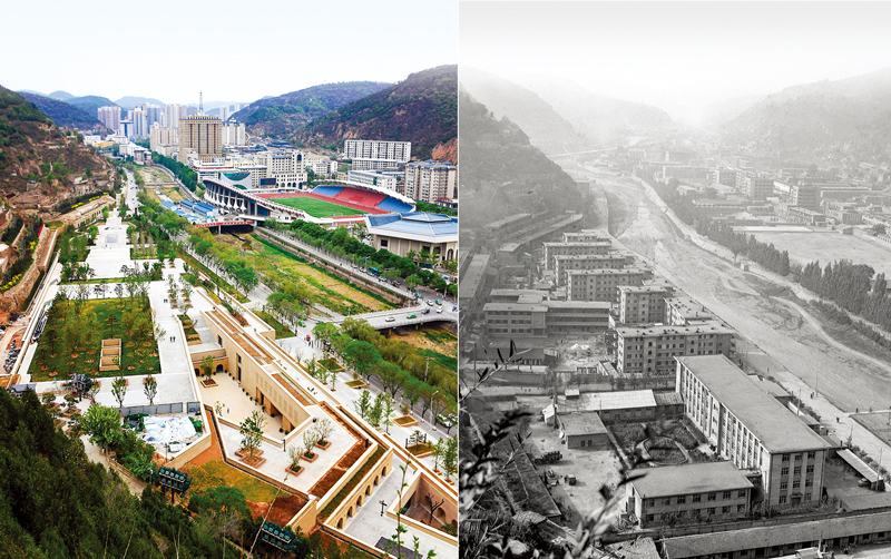 這是一張拼版照片,左圖為2019年5月5日拍攝的延安市南河河道(新華社記者 劉瀟/攝);右圖為1983年12月26日拍攝的延安市南河河道(資料照片)。