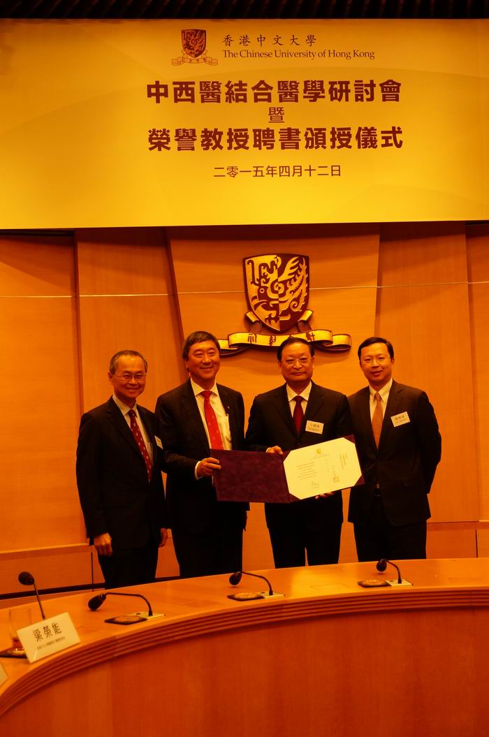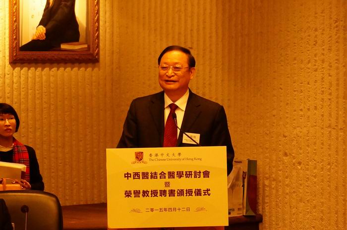 2015年4月12日,國家衛(wèi)生計生委副主任、國家中醫(yī)藥管理局局長王國強出席香港中文大學(xué)榮譽教授聘任儀式,并履行榮譽教授職責(zé),就內(nèi)地中西醫(yī)結(jié)合工作進展與展望做主旨報告。 王國強副主任系統(tǒng)介紹了中西醫(yī)結(jié)合在內(nèi)地醫(yī)療衛(wèi)生體系中的地位、人才培養(yǎng)模式、科研成果以及在臨床實踐中的突出作用,建議香港與內(nèi)地加強合作,以提高臨床療效為核心,發(fā)揮中西醫(yī)結(jié)合的優(yōu)勢;以提高綜合素質(zhì)為目標,加強中西醫(yī)結(jié)合人才建設(shè);以臨床需求為中心,加強中西醫(yī)結(jié)合科學(xué)研究;以文化繁榮發(fā)展為契機,推進大醫(yī)精誠核心價值觀。 香港中文大學(xué)校長沈祖堯主持聘任儀式,并為王國強副主任頒授榮譽教授證書。