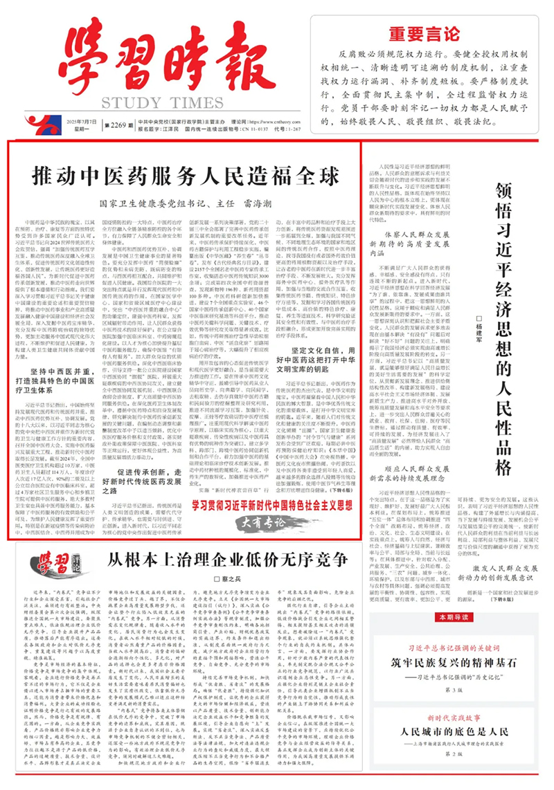 中醫(yī)藥是中華民族的瑰寶,以其在預(yù)防、治療、康復(fù)等方面的獨(dú)特優(yōu)勢(shì)受到許多國(guó)家民眾廣泛認(rèn)可。習(xí)近平總書(shū)記向2024世界傳統(tǒng)醫(yī)藥大會(huì)致賀信,強(qiáng)調(diào)“加強(qiáng)傳統(tǒng)醫(yī)藥互學(xué)互鑒,推動(dòng)傳統(tǒng)醫(yī)藥深度融入全球衛(wèi)生體系,促進(jìn)傳統(tǒng)醫(yī)藥文化創(chuàng)造性轉(zhuǎn)化、創(chuàng)新性發(fā)展,讓傳統(tǒng)醫(yī)藥更好造福各國(guó)人民”,為新時(shí)代促進(jìn)中醫(yī)藥傳承創(chuàng)新發(fā)展,推動(dòng)中醫(yī)藥走向世界提供了根本遵循和行動(dòng)指南。我們要深入學(xué)習(xí)貫徹習(xí)近平總書(shū)記關(guān)于健康中國(guó)建設(shè)的重要論述和重要賀信精神,將推動(dòng)中醫(yī)藥事業(yè)和產(chǎn)業(yè)高質(zhì)量發(fā)展融入健康中國(guó)建設(shè)和經(jīng)濟(jì)社會(huì)發(fā)展全局,深入發(fā)掘中醫(yī)藥寶庫(kù)精華,充分發(fā)揮中醫(yī)藥防病治病的獨(dú)特優(yōu)勢(shì),更加主動(dòng)服務(wù)中國(guó)式現(xiàn)代化偉大進(jìn)程,不斷維護(hù)和促進(jìn)人民健康,為構(gòu)建人類衛(wèi)生健康共同體貢獻(xiàn)中國(guó)力量。