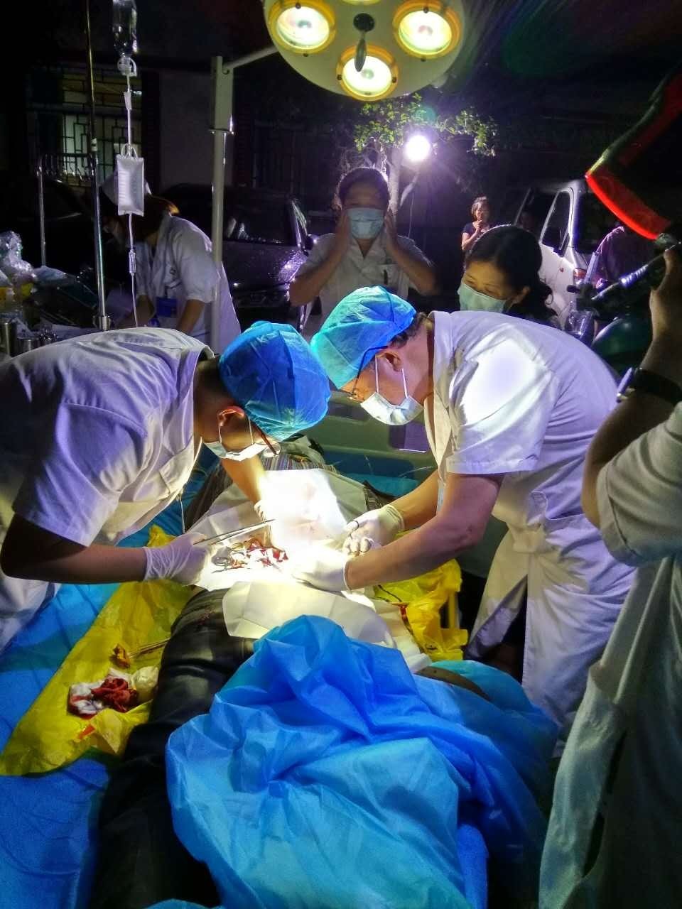 邛崍市中醫(yī)醫(yī)院外科主治醫(yī)師舒忠貴(圖右)在九寨溝縣中藏醫(yī)院開展手術(shù)搶救地震傷員。