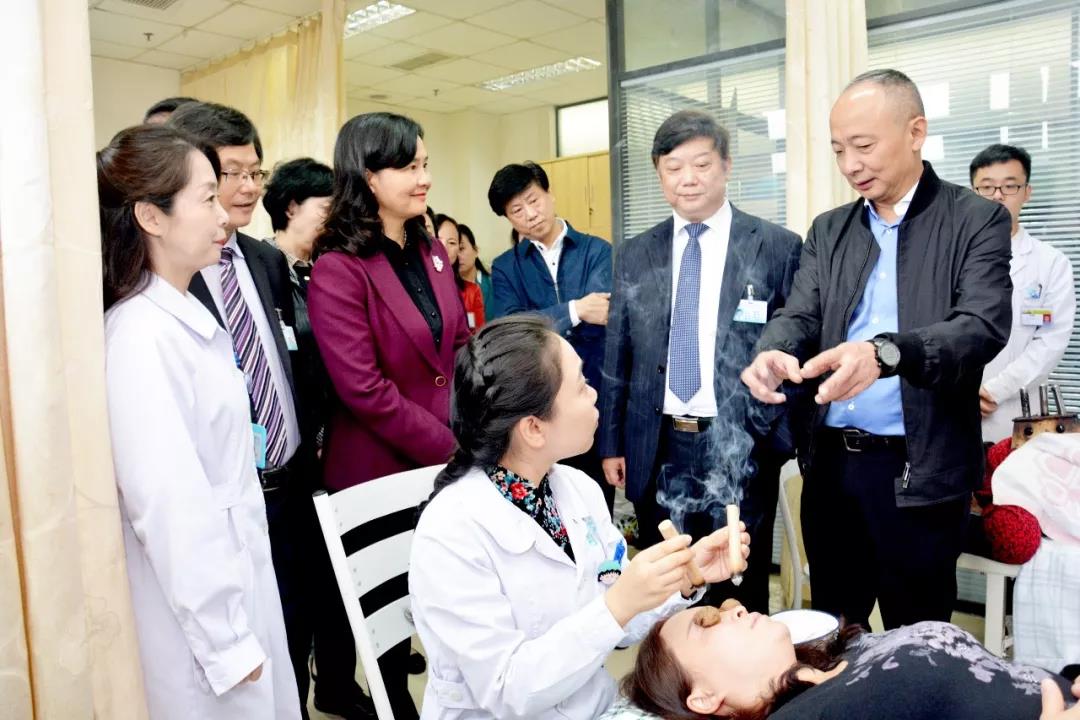 余艷紅書記(左三)在成都中醫(yī)藥大學附屬醫(yī)院治未病中心調研,四川省中醫(yī)藥管理局局長田興軍(右一)介紹該院核桃灸用于緩解眼部疲勞的好處。