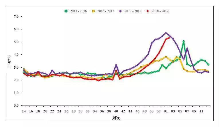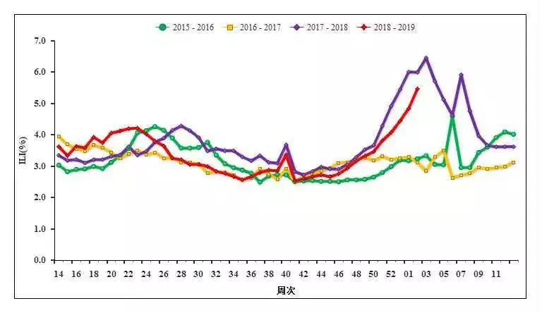 ▲圖2 2015-2019年度北方省份哨點(diǎn)醫(yī)院報(bào)告的流感樣病例百分比