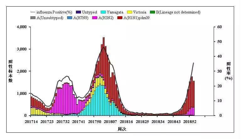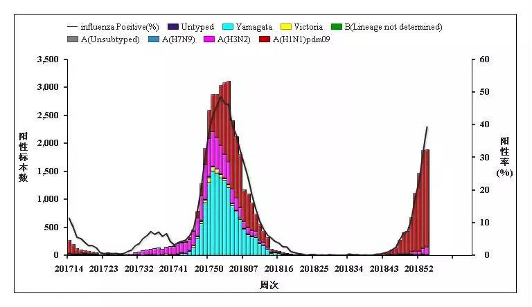檢測(cè)到的流感病毒主要亞型是甲型H1N1,其次為A(H3N2)亞型,但也能檢測(cè)到極少量的B(Victoria)和B(Yamagata)系。病原學(xué)分析未發(fā)現(xiàn)主要流行株在抗原性、基因特性和耐藥性上發(fā)生明顯變異,病毒對(duì)神經(jīng)氨酸酶抑制劑敏感。