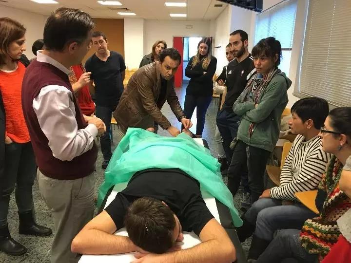 胡曼正在給各國針灸愛好者們演示針灸推拿療法。(圖片來源:新華社)