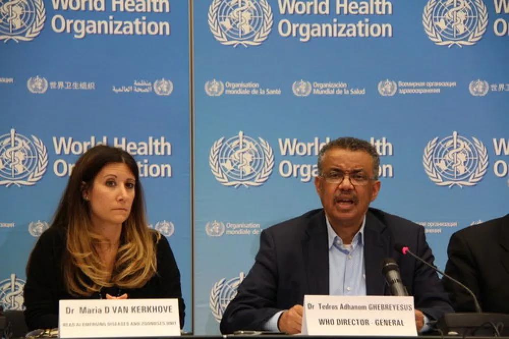 1月23日,在瑞士日內(nèi)瓦世界衛(wèi)生組織總部,世衛(wèi)組織總干事譚德塞(右)在記者會(huì)上發(fā)言。新華社記者劉曲攝