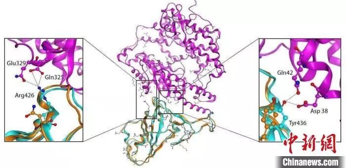 計算機模型:病毒S蛋白與人ACEⅡ蛋白結(jié)合示意圖中科院上海巴斯德所/供圖