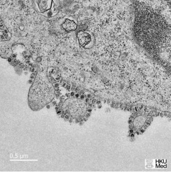 香港大學(xué)電子顯微鏡圖像顯示了在細(xì)胞中生長的新型冠狀病毒。