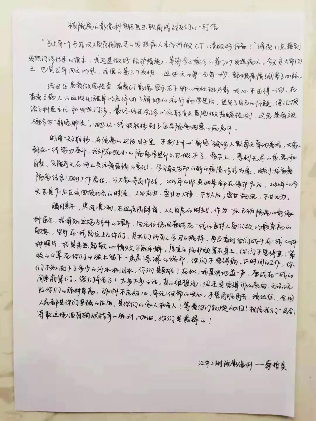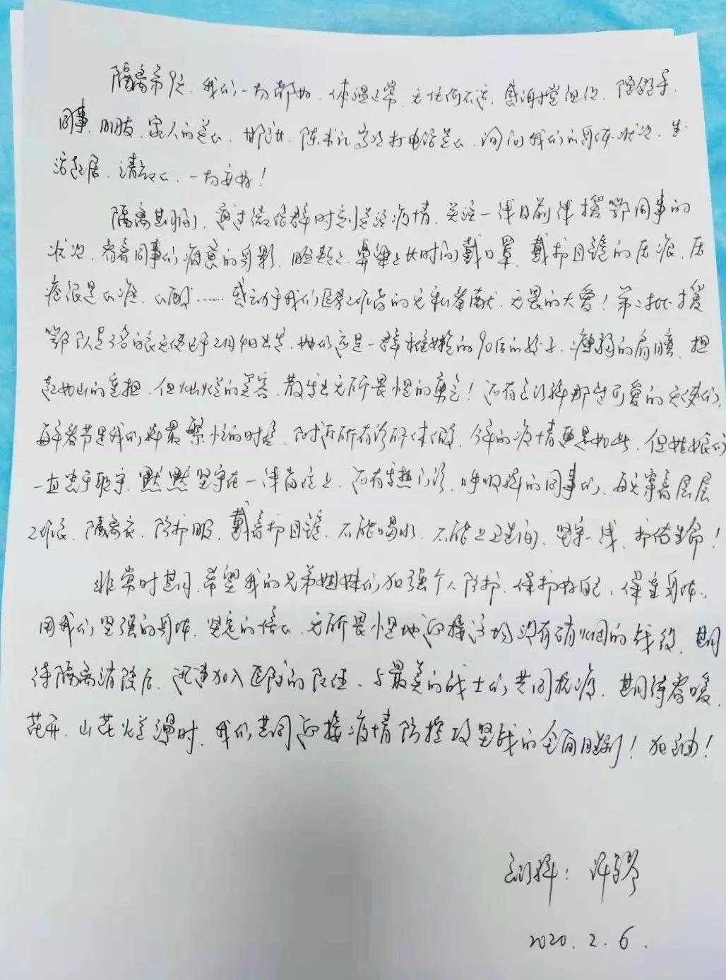 陳智華在隔離病房開啟了遠程辦公。臨床一線的醫(yī)生有什么問題,他都在微信或是電話這頭耐心解答,與前線的同事們一起抗擊疫情。許員琴隔離期間不忘囑咐科里的護士安排好工作,注意自身防護。其他醫(yī)務人員也從不放松新冠肺炎相關知識的學習,時刻為出來后奮戰(zhàn)一線做好充足準備!他們還給前線的醫(yī)生寫信加油鼓勁,解除隔離后,還要與大家并肩作戰(zhàn),共同抗疫!