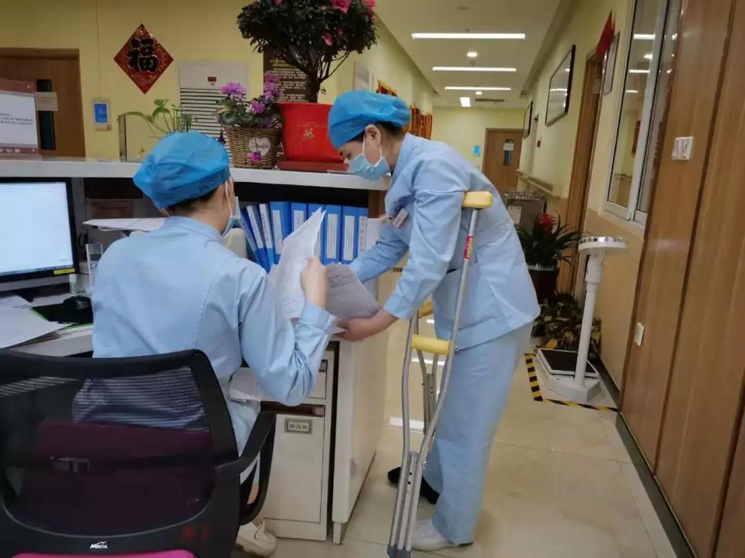 護(hù)理查房,處理醫(yī)囑,收治病人,防疫指導(dǎo),健康宣教…….每天畢靖靖護(hù)士長還是和往常一樣,早早的來到病房,開始新的一天緊張的護(hù)理工作。一刻也不放松,一刻也不停歇,樂觀的笑容總是浮現(xiàn)在她的臉上,而一整天下來,帶著沉重石膏的右腳經(jīng)常都是腫脹的,架起拐杖的胳膊也時常酸痛難忍,本來不熱的季節(jié)汗水卻常常打濕了衣裳……為了不耽誤工作,也為了不讓同事們擔(dān)心,她總是默默忍受著,有時實(shí)在疼的受不了便偷偷躲在治療室,運(yùn)用自己多年的骨科護(hù)理經(jīng)驗(yàn)處理受傷的右腳,稍稍緩解忙碌的身影便又出現(xiàn)在了病房中。