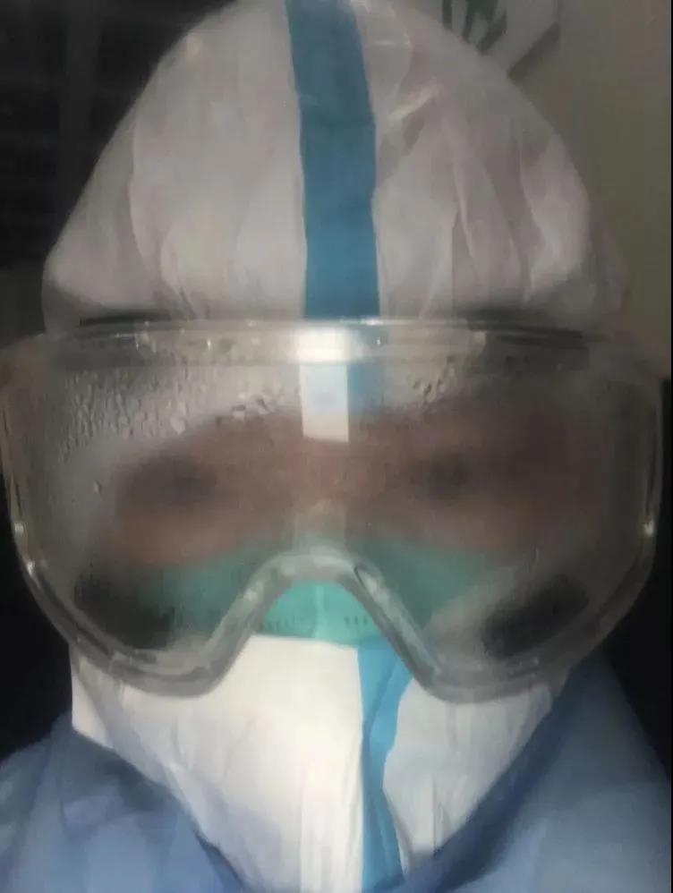 這張照片是我剛帶上護目鏡1個小時的樣子,護目鏡里面全是霧水,在這樣的情況下,我還得工作5、6個小時,不吃、不喝、不拉,只為了防護服外我們守護的那些戰(zhàn)友們,她們用堅強樂觀的精神感動著我們,我們理應(yīng)回報同樣的努力!