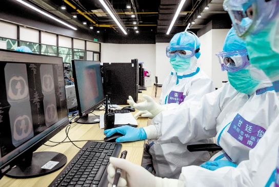 2月25日,湖南省援鄂抗疫國家中醫(yī)醫(yī)療隊醫(yī)護人員,在武漢市江夏區(qū)方艙醫(yī)院為新冠肺炎患者會診中醫(yī)治療方案。(湖北日報全媒記者 張鴻 通訊員 涂麗 攝)