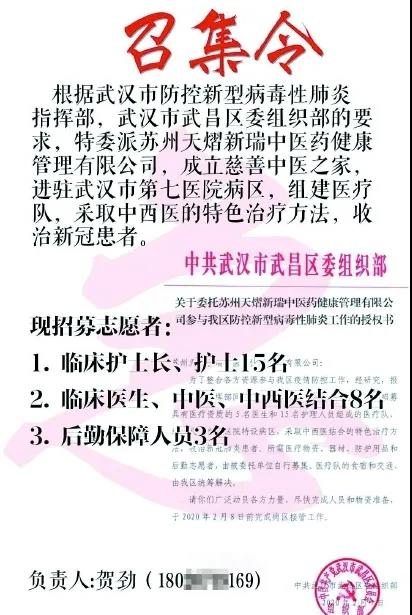 這群中醫(yī)的故事要從一道征集令說起。2月初,武漢招募個體中醫(yī)志愿者的公告在業(yè)內(nèi)流傳:“中共武漢市武昌區(qū)委組織部授權(quán)蘇州天熠新瑞中醫(yī)藥健康管理有限公司,成立慈善中醫(yī)之家,招募具有資質(zhì)的5名醫(yī)生和15名護理人員組成醫(yī)療隊,進駐武漢市第七醫(yī)院特設(shè)病區(qū),采取中西醫(yī)結(jié)合的治療方法,收治新冠肺炎患者。”