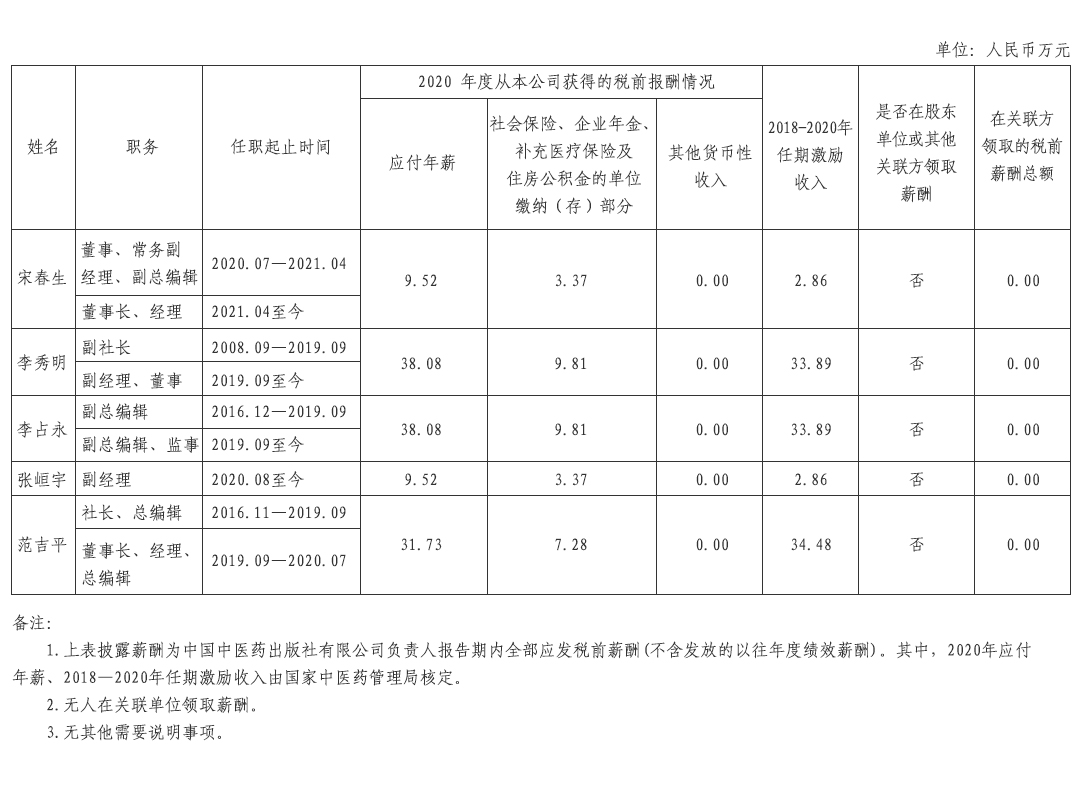 中國(guó)中醫(yī)藥出版社有限公司負(fù)責(zé)人2020年度薪酬情況
