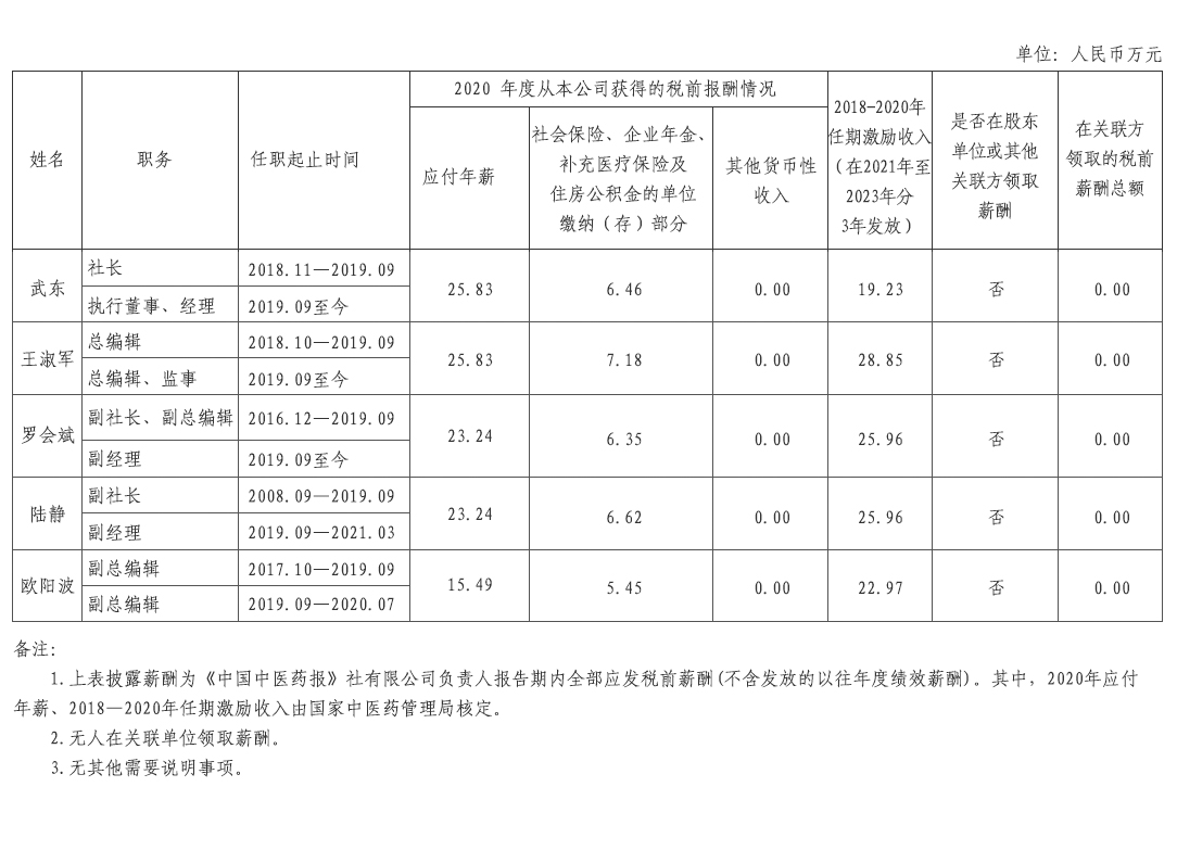 《中國中醫(yī)藥報》社有限公司負責人2020年度薪酬情況