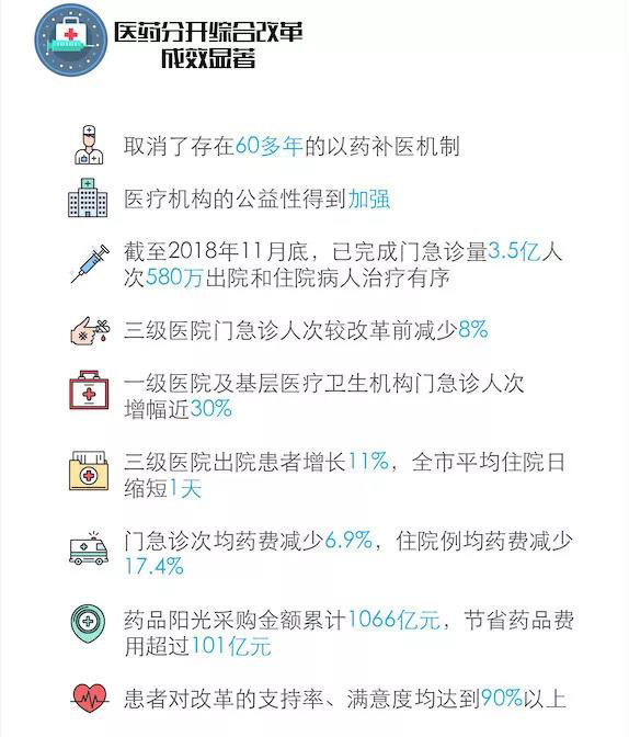 北京從2017年4月實(shí)施醫(yī)藥分開綜合改革以來,總體平穩(wěn)、符合預(yù)期、反響良好。截至2018年11月底,已完成門急診量3.5億人次,580萬出院和住院病人治療有序,取消了存在60多年的以藥補(bǔ)醫(yī)機(jī)制,醫(yī)療機(jī)構(gòu)的公益性得到加強(qiáng)。