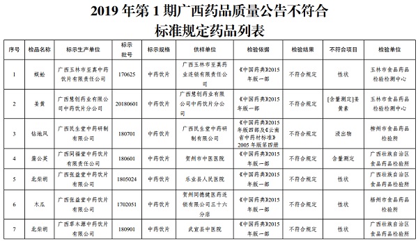 中國質(zhì)量新聞網(wǎng)訊 2019年3月5日,廣西壯族自治區(qū)藥品監(jiān)督管理局網(wǎng)站發(fā)布藥品質(zhì)量公告(2019年第1期)。經(jīng)核查確認(rèn),對(duì)抽檢不符合標(biāo)準(zhǔn)規(guī)定的7批次中藥飲片予以公告。