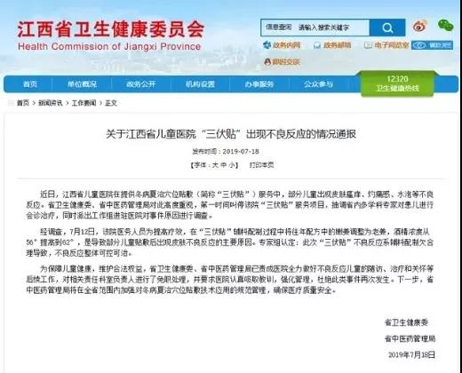 關(guān)于江西省兒童醫(yī)院“三伏貼”出現(xiàn)不良反應(yīng)的情況通報